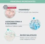 A composição contém ingredientes conhecidos por suas funcionalidades específicas, como agentes que trabalham na redução de pontos escuros e agentes que ajudam a deixar a pele mais confortável e com sensação de suavidade.