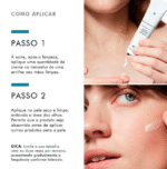 Aplique uma pequena quantidade à noite, sobre a pele limpa e seca. Utilize em noites alternadas no início da rotina e ajuste conforme sua adaptação. Durante o dia, use sempre proteção solar.