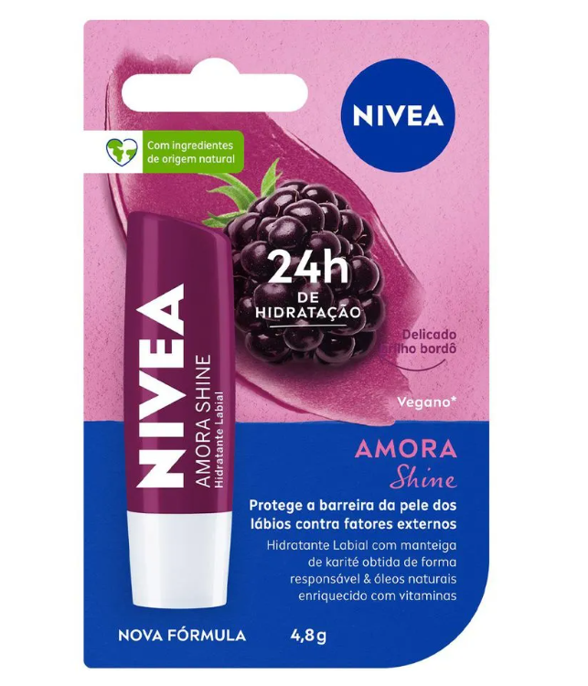 O Hidratante Labial Nivea Amora Shine 4,8g é um produto para cuidado diário dos lábios, desenvolvido para ajudar a manter a hidratação e proporcionar brilho suave com leve tonalidade inspirada na amora.