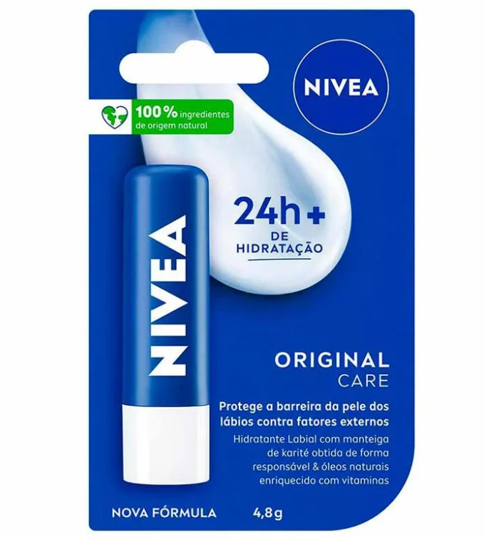 Hidratante Labial Nivea Original Care 48g O Hidratante Labial Nivea Original Care 4,8g foi desenvolvido para manter os lábios hidratados e macios ao longo do dia. Ajuda a proteger os lábios contra ressecamento causado por vento, frio e clima seco, proporcionando conforto imediato. Com textura suave, espalha facilmente e deixa os lábios com aparência saudável e natural. Pode ser usado sozinho ou antes de outros produtos labiais. Benefícios Mantém os lábios hidratados Ajuda a conservar a maciez Textura leve e fácil de aplicar Acabamento natural, sem cor Indicado para uso diário Modo de uso Aplicar nos lábios sempre que sentir necessidade de hidratação. Reaplicar quantas vezes forem necessárias ao longo do dia.